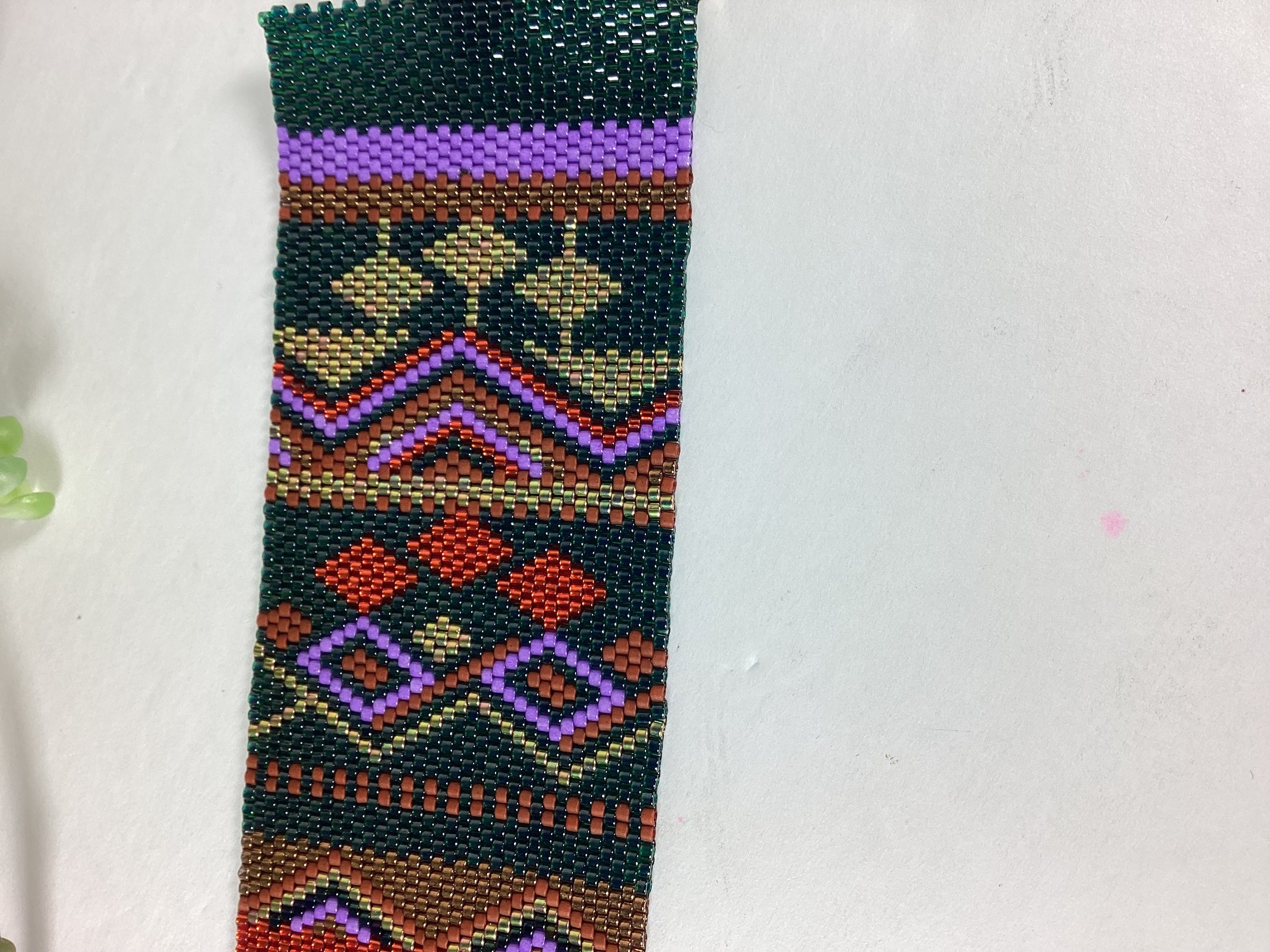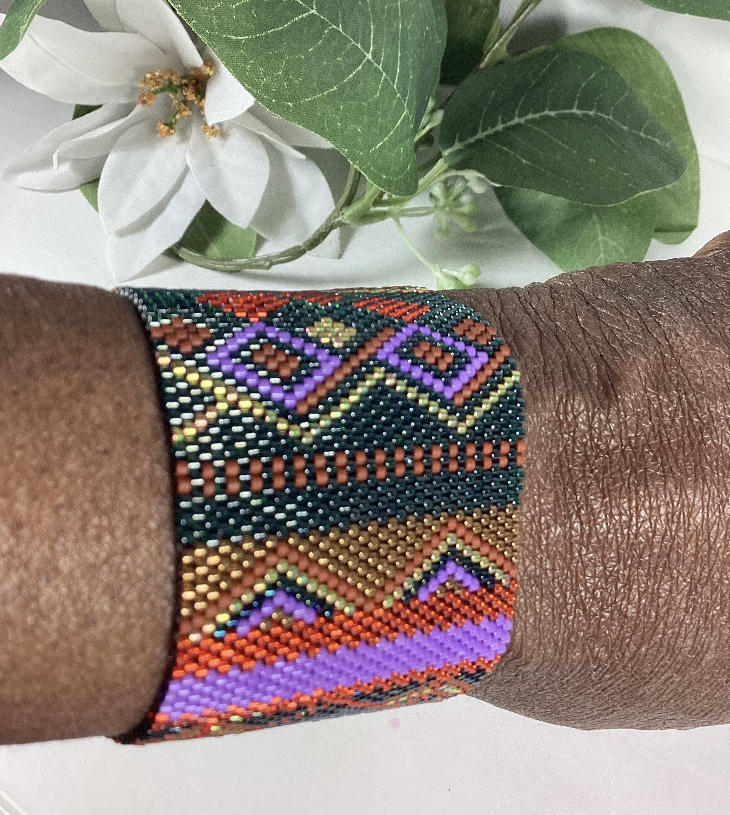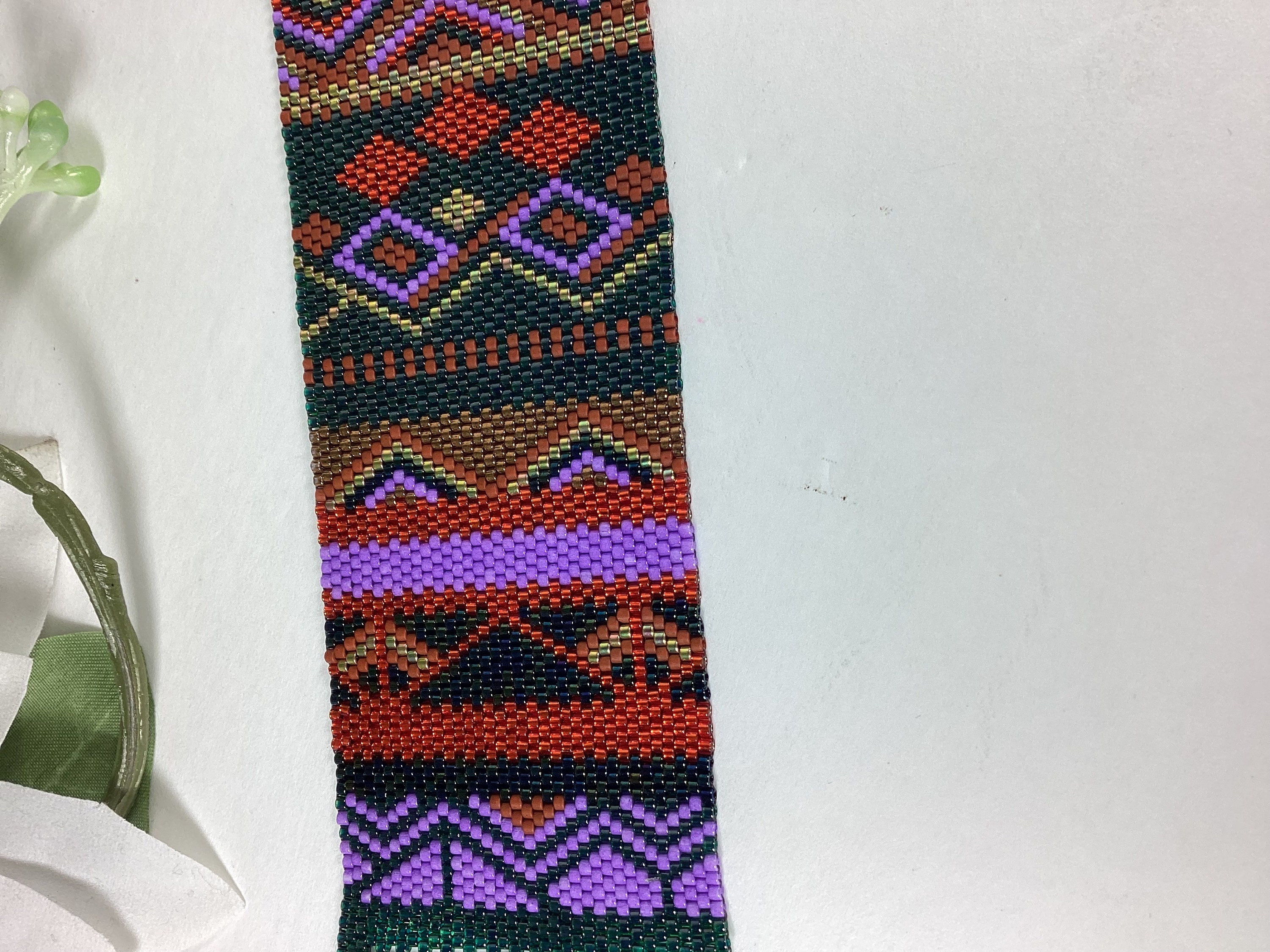 This stunning bracelet is a true work of art, handcrafted with intricate peyote stitch using high-quality Miyuki Delica beads. The tribal design exudes a timeless elegance, making it suitable for both daytime and evening wear. Each bead is expertly woven into a beautiful pattern to create a unique and eye-catching accessory. This one-of-a-kind piece of jewelry is perfect for adding a touch of bohemian charm to any outfit and is sure to be a conversation starter wherever you go. Elevate your personal style with this handmade bracelet that reflects the passion and skill of its artisan creator.