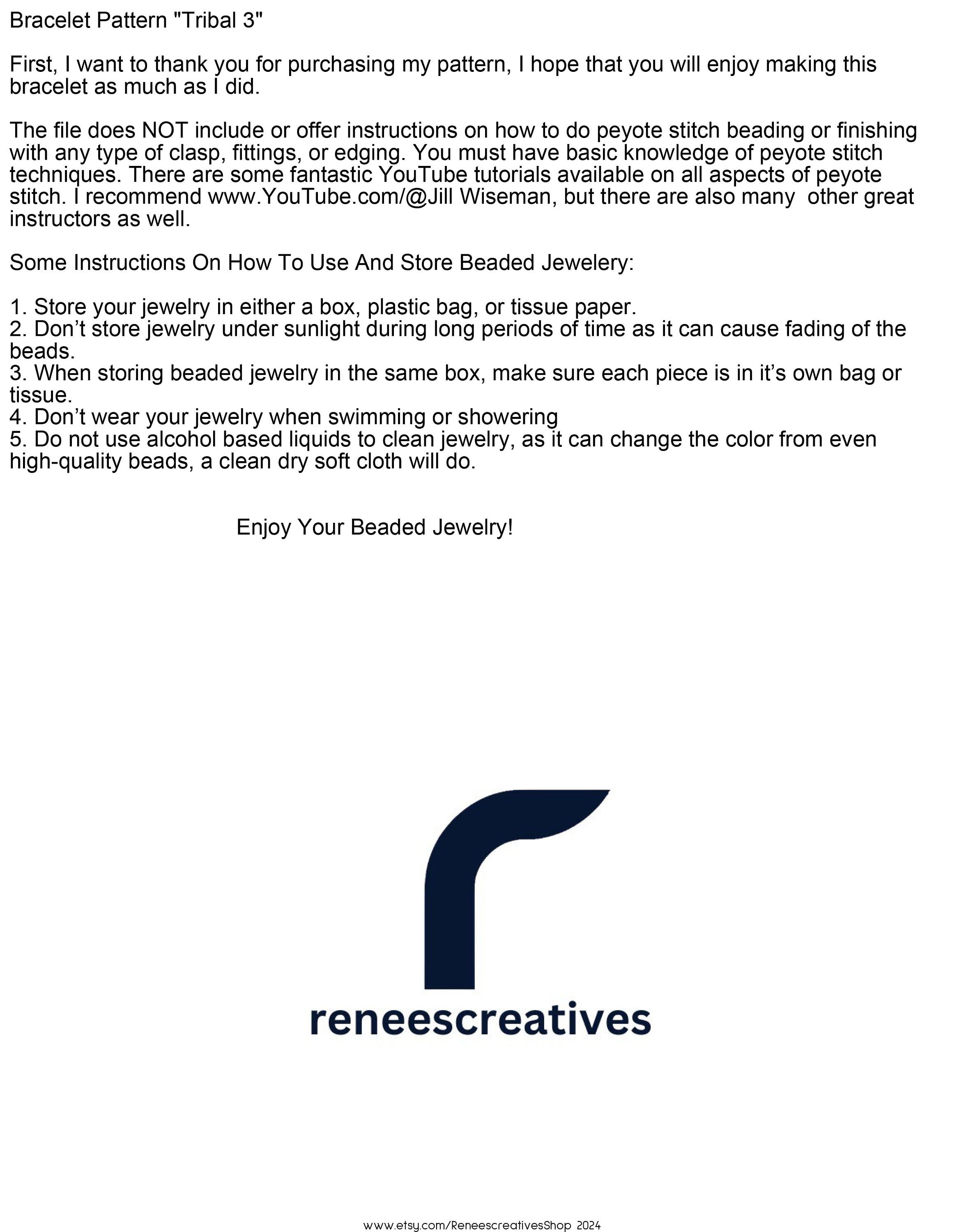 The file does NOT include or offer instructions on how to do peyote stitch beading or finishing with any type of clasp, fittings, or edging. You must know peyote stitch techniques. There are some fantastic YouTube tutorials available on all aspects of peyote stitch. I recommend